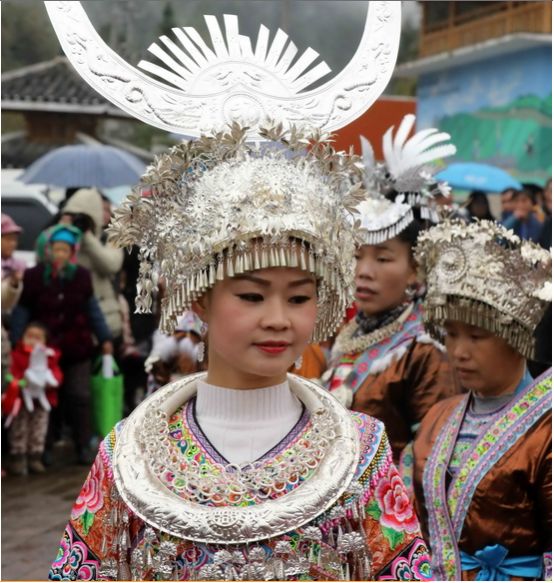 苗族头饰主要是以银饰为主。苗族女孩从学会走路开始,父母就会给女儿制作一套苗族民族盛装和头饰,苗族女孩一般6岁左右就可以参加每年的民族盛会,并且从小学习化妆技术。苗族的盛会主要集中在春节后,也叫坡会,就是山坡上的聚会,这一天苗族姑娘就会穿上珍藏已久的民族盛装,戴上头饰,把自己打扮的漂漂亮亮,参加芦笙踩堂舞,展示自己的美丽一面。
