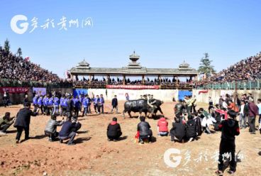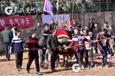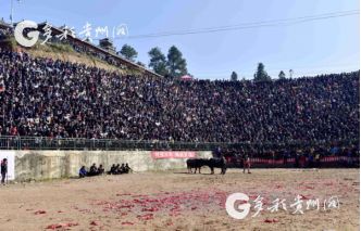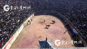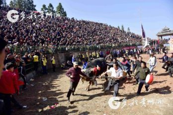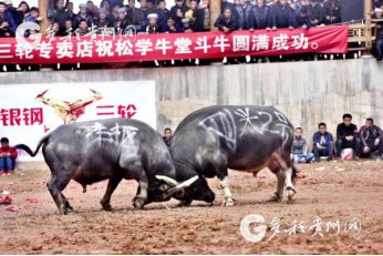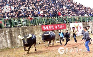 贵州省从江县第十五届原生态侗族大歌节的前一天,恰逢该县逢亥斗牛日,丙妹镇松学斗牛塘、谷坪乡四寨河斗牛塘同时举办传统牛王争霸赛,喜迎一年一度“侗族大歌节”的到来,共有来自周边村寨的80头水牯牛参战,斗牛活动场上名牛角逐,场面异彩纷呈,吸引数万名观众前来观战。