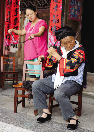 梳盛装发型时,需要用到假发、毛线等辅助工具来补充发量,才能令整个发型丰满有型。虽说是假发,也是用收集来的真发编制而成的。盘发过程中女儿王万就在一旁协助母亲。其实王万这一辈人,已经不会梳这种传统的发型了。