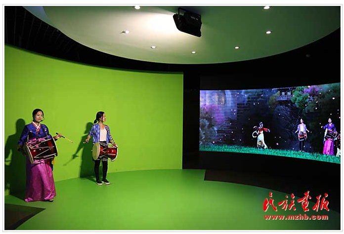 在长鼓舞体验区,参观者纷纷走到长鼓前,随着荧屏上显示的节奏与动作提示,体验长鼓舞的高雅飘逸,另一侧大屏幕上,显示出相应的歌曲与舞蹈