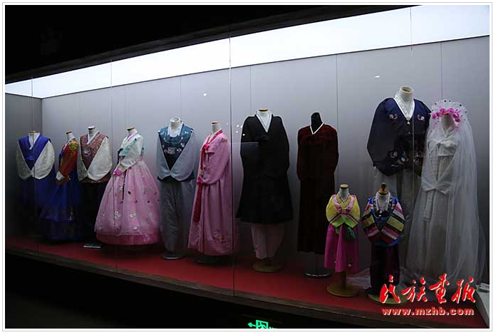 展厅最后一个展区是朝鲜族服饰展柜,素净、淡雅的朝鲜族传统服饰