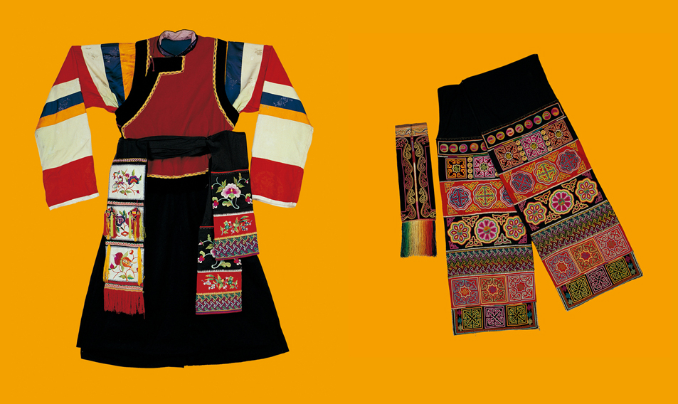 图为青海互助土族彩袖女服与牡丹纹布腰带,中央民族大学民族博物馆馆藏