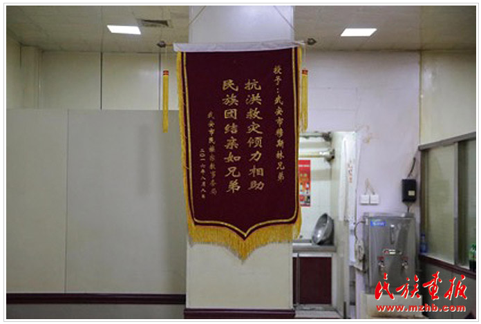 武安市民族宗教事务局赠送的锦旗现在仍挂在羊汤馆最醒目的位置
