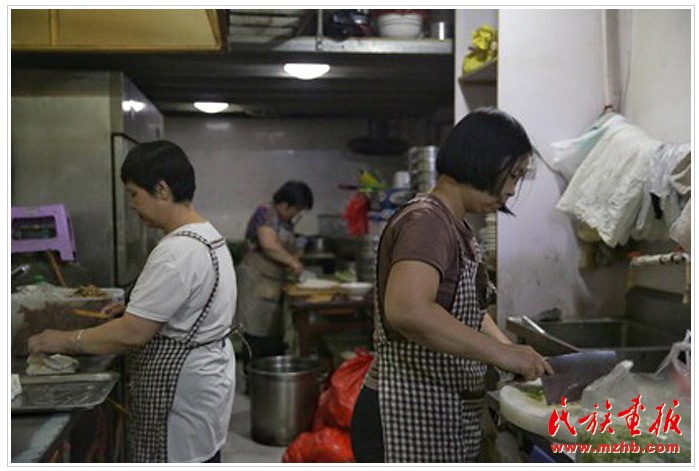 后厨忙碌的回族员工精心准备着食材