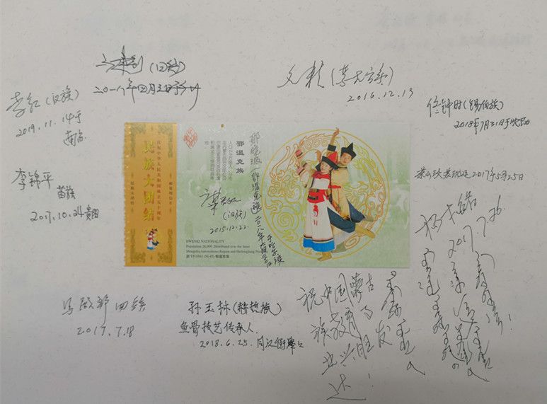 在采集口述影像录音资料的同时,项目组还收集了大量的珍贵历史照片以及相关文物。值得一提的是,他们设计了一种非常有特色的受访者签名簿,中间贴着绘有56个民族的音乐舞蹈图案的首日封或明信片,四周签上受访者的人名签名字、民族特征,有些还用民族文字书写,体现了中华各民族团结在一起的精神风貌。签名簿有厚厚的几大本,设计精美,承载着民族工作口述史资源采集的经历,具有丰富的文化内涵和博物馆收藏价值。