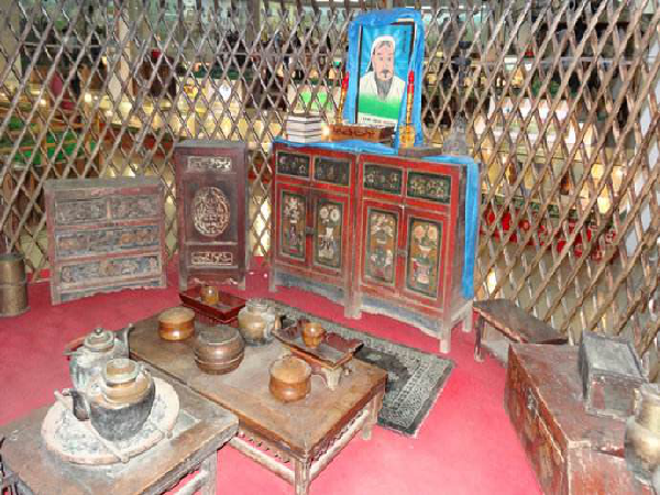 亚洲游牧、游猎民族创造的移动式民居,在其发展过程中形成了两大流派:一种是中国鄂伦春人的传统建筑歇仁柱式(在鄂伦春语里歇仁柱为“木杆屋”之意),即尖顶、用兽皮或树皮、草叶子做苫盖。另一种是蒙古包式的,即穹顶圆壁,主要用毛毡做其覆盖物。蒙古包的包门开向东南,既可避开西伯利亚的强冷空气,也沿袭着以日出方向为吉祥的古老传统。而帐内的中央部位,安放着高约二尺的火炉。火炉的东侧放着堆放炊具的碗橱,火炉上方的帐顶开有一个天窗。火炉西边铺着地毡,地毡上摆放矮腿的雕花木桌。包门的两侧悬挂着牧人的马鞭、弓箭、猎枪以及嚼辔之类的用具。帐内的西侧摆放着红漆彩绘木柜,木柜的北角上敬放着佛龛和佛像,佛像前供放着香炉及祭品。