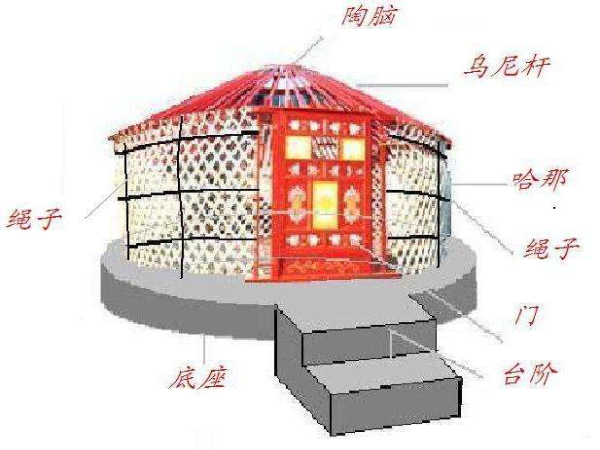 蒙古包主要由架木、苫毡、绳带三大部分组成。