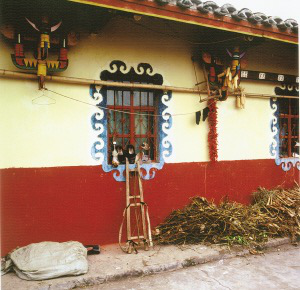 四川昭觉彝民民居独有的牛头装饰。最能展现彝族建筑特色的要数前屋檐的挑拱了。屋檐的装饰在建房时从墙上穿枋垂柱形成,少则3层,多则5层,上层垂柱上雕成牛角形托起屋檐的横梁,下层垂柱上雕有形象逼真的装饰牛角,垂柱的卡槽为牛蹄形、马牙形,蹄尖向内,以示招财进宝。穿枋向上弯曲,与垂柱的牛蹄呼应,传统的穿枋雕刻日月星辰、飞禽走兽和条形图案。