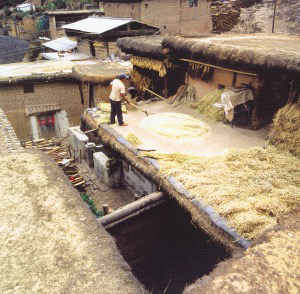 土掌房屋顶 云南楚雄地区的土掌房,是土墙、土顶、外墙和底层无窗的两层楼房。有的内院也盖屋顶,称“无内院式”。设天窗采光,屋顶还能当晒台。整个村落沿山坡而建,巷道很窄,远远望去,你家的屋顶是他家的院坝,只要上了一家屋顶,就能靠活动的木梯自由往来。