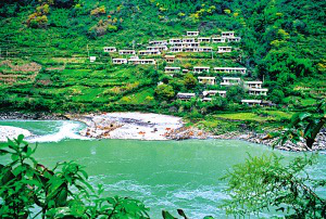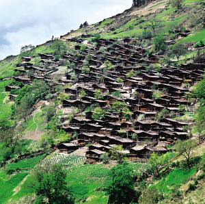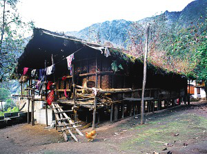 在怒江上游峡谷聚居的傈僳村寨都建在高山的半山上,其民居俗称为“千脚落地房”。说“千脚落地”虽有些夸张,但也足以形象地说明峡谷温热的气候和山高坡陡的地理条件。在雨季时,“千脚”阻力最小,使山洪顺利倾泻而下,又很快干爽,免受潮气。而且不需挖地动土,不必移石砌墙,对木料没有过高要求,长短皆用,在生态脆弱的高山峡谷也算环保建筑。“千脚落地”是因建房时先在确定的屋基上依斜坡程度和住房面积打进数十根到百余根木桩为基桩,以保证居室楼板的平正。基桩打好后,除四面留几根高柱作为整个房屋的立柱外,在密集木桩所形成的平面上满铺竹篾编织的楼板,还有竹篾围墙,所有结构皆用竹篾绑扎。屋顶铺苫草或盖木片瓦,近几年,已陆续换上了大块的水泥波形瓦。房门开在山墙一侧,有廊道,可做晒台,平时穿的衣服都搭在这儿,也是妇女做针线活的地方。随着怒江峡谷的开发和新农村建设的深入,通路的村寨将很快会改变面貌。