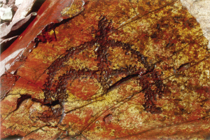 彩绘岩画作为南系岩画的主要代表类型,在宁夏境内并不多见,仅在石嘴山白芨沟的一处坐北朝南的天然洞窟中发现,岩洞敞开,可容纳数百人。被发现的彩绘岩画分布在高8米、长10米的崖壁上,坐西向东,以赭石颜料涂绘,有24组42幅精美的岩画,内容包括狩猎、骑者、牧归,以及牛、羊、马、狗等动物。这些罕见的彩绘岩画时至今日依然是“养在深闺人未识”,更让人担心的是随着环境污染造成的自然破坏已经让这些彩绘岩画颜色发白,亟待引起重视,加以保护。