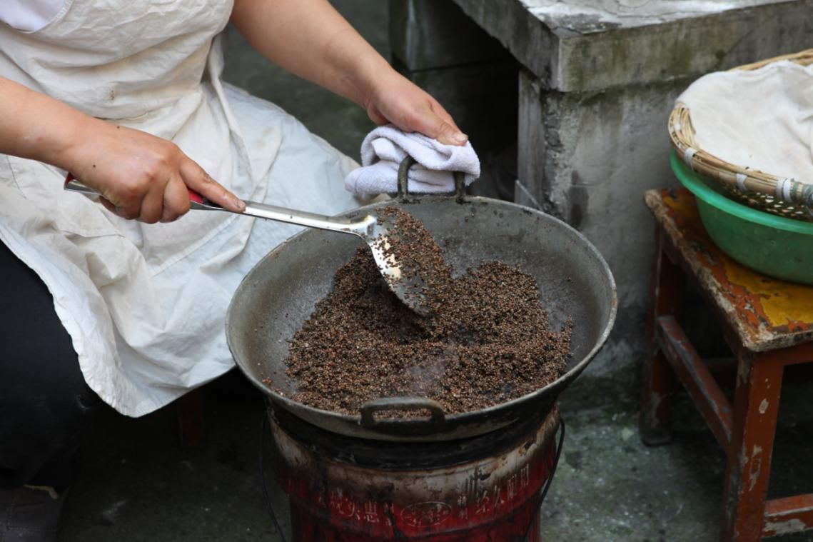 清明粑馅心的原材料,包含百分之五十的苏麻、百分之三十的花生、剩余部分是白芝麻、玫瑰糖和白糖,加工过程颇为繁琐。黄家英将白芝麻、花生、苏麻洗净后,分别放入铁锅中翻炒,小火防止局部焦糊,不断翻炒使得每一颗都能受热均匀。