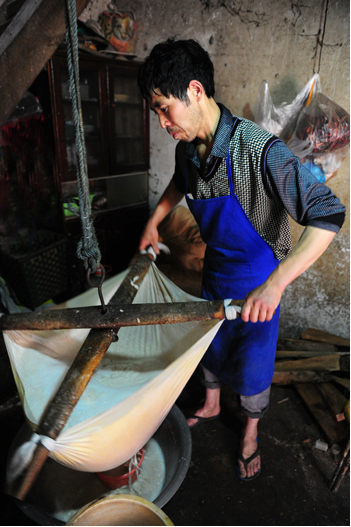 记者看到,主人开始磨豆子了,将泡好的豆子倒入机器内,一勺一勺的盛。并一边磨一边和我们交谈,现在省事多了,以前都是推磨子的,而且制作工艺也十分讲究。