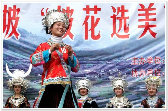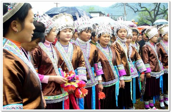 广西融水县的香粉古龙坡会于每年农历正月十六举行,所以又名“十六”坡。这一天、来自外国朋友、各地的游客及当地方圆十里的苗哥苗妹,提芦笙,提鸟笼、牵马匹,打花伞……朝着十六坡赶来。正午时分,山梁上、村道间、河溪旁,出现了成列成队穿红戴绿的人群。远远望去,似一条彩带在飘动。当万余人江集后,整个坡地就成了彩色的世界。