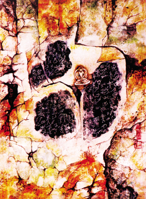 纳西象形文在纳西语中称为“斯究鲁究”,意思是“木石上的痕迹”或“木石上的记录”。作品以残缺不全、难窥全貌的东巴经卷和木牌画上的各种原始形象和文字符号组成画面,那些刻写在木石上历经千年的文化痕迹若隐若现。