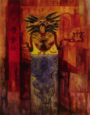 和向东:7年前认识北京至高美术馆馆长林青先生后,他建议用油画来表现东巴文化,从那时起,没画过油画的我开始了油画的创作。说实话,我一直认为不适合用油画形式来表现东巴文化,不过经过多年的尝试,我现在有了一种“重彩油画”的意味了,比较讲究画面的偶然性。云南重彩画派的斑斓厚重和富丽的色彩表现效果我一直很迷恋,我力图想把这些色彩感觉用油画语言表现出来,当然还处在摸索尝试中。虽然都是油画,但与专业油画家的作品相比,我的“油画味”不是很浓,也许这就是我的作品特色吧!