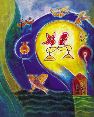作品以东巴象形文字“男女相拥”符号为主,还以“双鱼、心、男女起舞、家”等与爱情相符号组成画面
