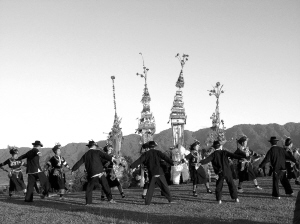 登窝罗时,领唱的人在前,这人叫“稍干”。其他人双手叉腰,跟着稍干唱。边唱边大蹲大跳,一会儿背对背,一会儿面对面。春节围着窝罗牌坊跳,平时围着一张摆满烟酒茶果的桌子跳,意思是围着太阳、月亮转。