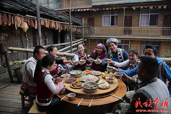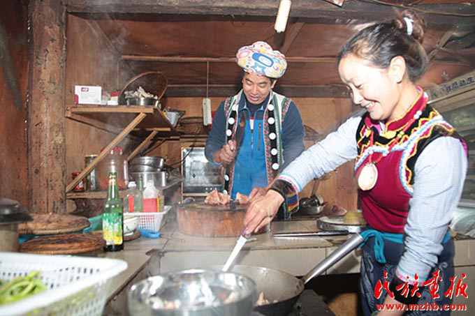 早上,老姆登村73岁的怒族老人斯普早早起来招呼儿子郁伍林、儿媳鲁春花:“春节快放假了,客栈的生意会忙得不可开交,趁着现在客人不多,家里人先吃一顿团圆饭吧。”斯普老伴早年过世,7个儿女中老五郁伍林在身边照顾她。“过去在春节才能吃上一顿好饭菜,也要准备很长时间,现在每天都有好吃的,天天在过年,多亏了党的好政策。”说起今天的幸福生活,生在旧社会的斯普感慨万千。