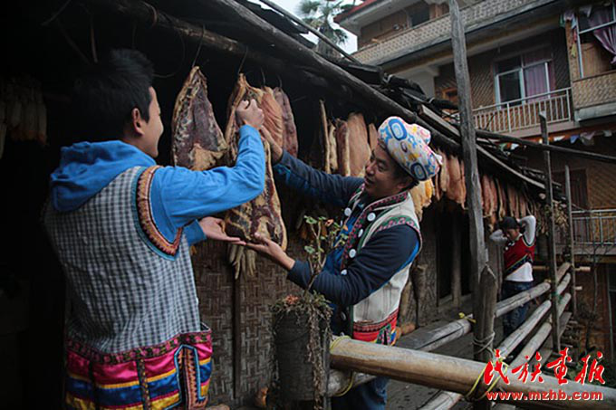 郁伍林和儿子郁乐选取怒族特色食材之一琵琶肉(腊肉)