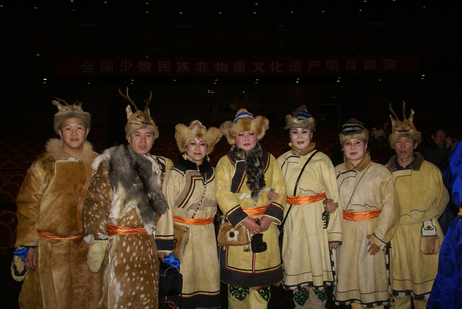 游猎时期鄂伦春人的服饰基本都是用兽皮制作的。用兽皮缝制衣服,首先要熟化兽皮,先把皮子晒干,将煮熟的狍肝捣烂,涂抹在皮板上再喷一些水,包好闷几天,使皮板变软。熟皮子时坐在地上,用双脚夹住皮子的一角,先用“克得热”(约二尺长的弧形带锯齿刮具)反复刮揉,待皮膜和污垢暴起,再用“毛担”(又称“毛贺得勒”,约二尺长的弧形钝刃刮刀)刮掉,就这样反复揉刮,直至皮板柔软且富有弹性为止。最后,几个人配合,将柔软的皮张放在朽木火上,一边熏烤一边均力拉伸,皮张就变得平平展展了(右图为鄂伦春传统服饰,头戴狍头帽,刘军供图)。