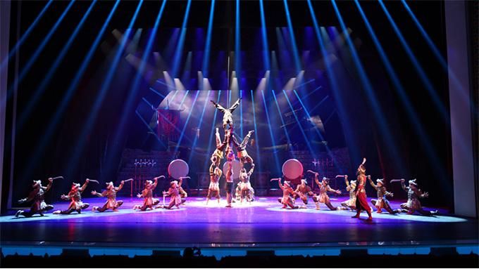 杂技是这部剧的一大亮点。新疆生产建设兵团杂技团近年来编创了《天鹅湖—男子倒立技巧》《向太阳—绳技》《春之韵—女子造型》等多个精品节目,并在国内外重大杂技赛场多次获奖。《楼兰寻梦》中,主创团队将这些获奖节目进行拆解,将蹬鼓、独轮车、吊环、肩上芭蕾、水流星及舞中幡等杂技技巧与戏剧元素相融合,让观众犹如置身于黄沙漫漫的丝路古国。