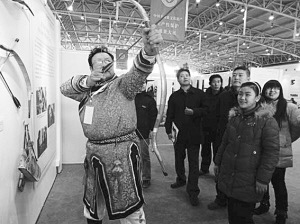 日前,在北京举行的非遗生产性保护成果大展上,几名观众围拢在一个身材魁梧的锡伯族老人周围,但见他身罩长袍,足踏薄底靴,双目圆睁,两臂运力搭弓上箭,俨然就是准备步射的骁将。这位老人就是锡伯族传统弓箭技艺传承人伊春光,老汉手中的弓重近1公斤,是他亲手制作的。