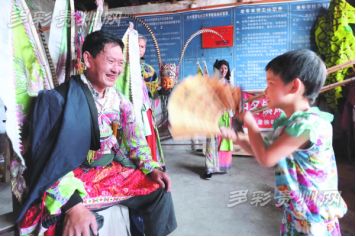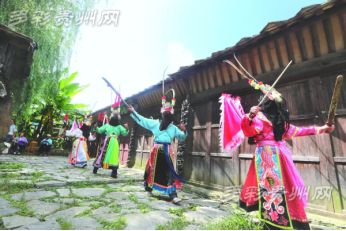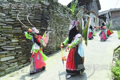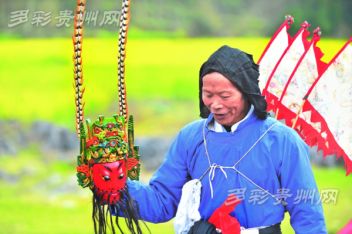 安顺地戏的显著特点是演出者头蒙青巾,腰围战裙,戴假面于额前,手执戈矛刀戟之属,随口而唱,应声而舞。