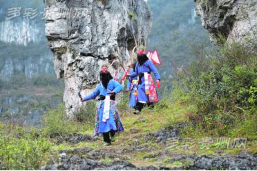 地戏演员利用劳作空闲时间在山间排练地戏。