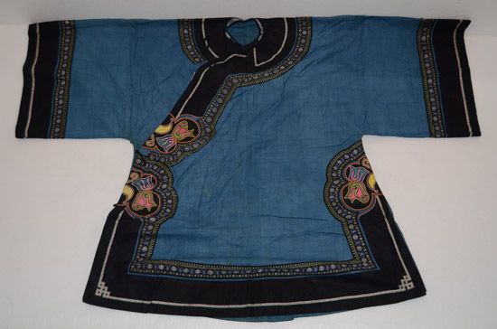 分布在凯里、雷山、丹寨、麻江四县交界地一带苗族村寨,以凯里舟溪苗族为代表。该服装上衣为缎面对襟衣,刺绣主要在肩袖及袖口部分,以黔东南苗族特有的茧片绣为主,所绣图案为浮萍花和几何纹,肩部和背部镶有银泡和银片,具有民族特点 。前、后围腰片均以茧片绣为主,所绣图案为浮萍花和几何纹。