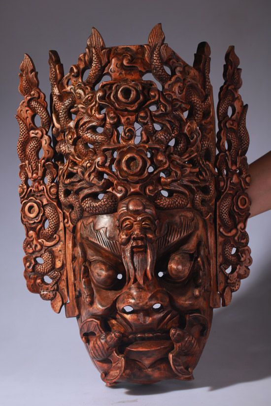 描述:程咬金,字义贞,原名咬金,后更名知节。骁勇善战,历史上是唐朝开国名将,以“三板斧”的形象在民间广为流传。在地戏唱本《薛仁贵征东》和《薛丁山征西》中,均有程咬金的出场。根据《隋唐演义》的内容,程咬金虽然头脑简单,却是个有福之人,被认为是福将,所以在地戏面具的刻画上,在嘴角两侧雕刻上一堆蝙蝠,以取“福”的谐音。又因为程咬金在唐代算是长寿之人,故尔额头上刻一寿星,带给人福寿双全的吉祥含义。