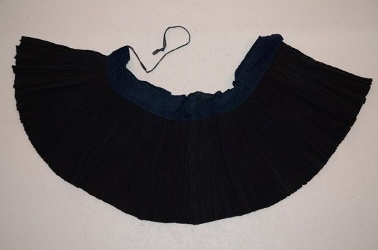 裙子腰部为家织土布,裙身细褶裙,由素色蓝布、腊染布、织锦布拼连而成。