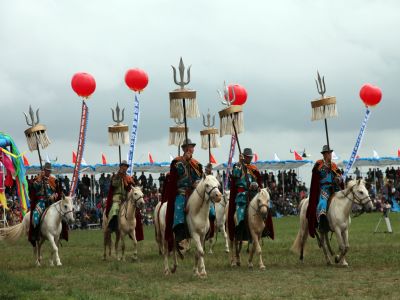 图片说明:蒙古族体育比赛马队进场